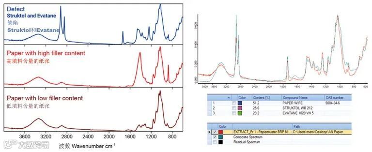 第二个案例鉴定了一个小缺陷(见上),并分析了样品中的填料分布。下图显示了不同位置缺陷和纸张的光谱。纸张光谱显示了典型的纤维素谱带和不同含量的碳酸钙,这些信息在缺陷谱也得到了体现。图中还显示了其他无法解释的谱带。通过混合物检索分析,我们可以确定这些成分分别是为纸张、Struktol®和Evatane®(下图)。
