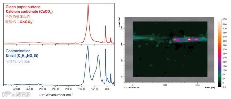 左:纸张表面的谱(干净的纸张区域和污染的纸张区域)