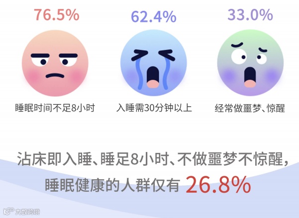 拥有完全健康睡眠人群占比只有26.8%,近3/4的人面临着睡眠时间不足、入睡时间过长、睡眠质量差等问题。