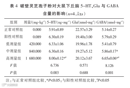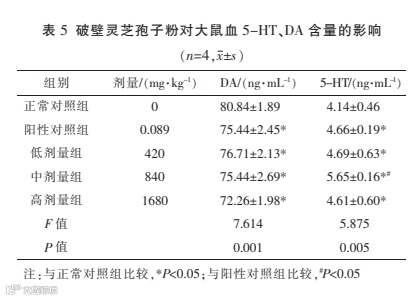 研究结果表明,破壁灵芝孢子粉不仅能够下丘脑与血浆中5-HT含量,还能有效调节下丘脑GABA与Glu的含量,维持两者平衡,并且能降低血浆中DA水平。