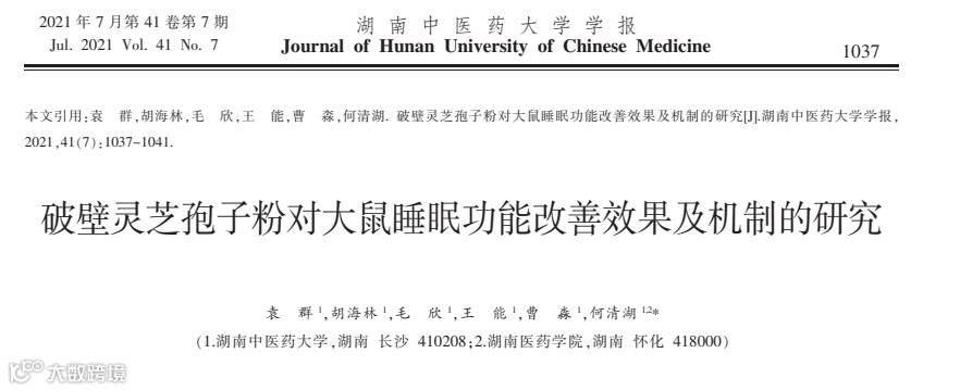 [1]袁群, 胡海林, 毛欣,等. 破壁灵芝孢子粉对大鼠睡眠功能改善效果及机制的研究[J]. 湖南中医药大学学报, 41(7):5.