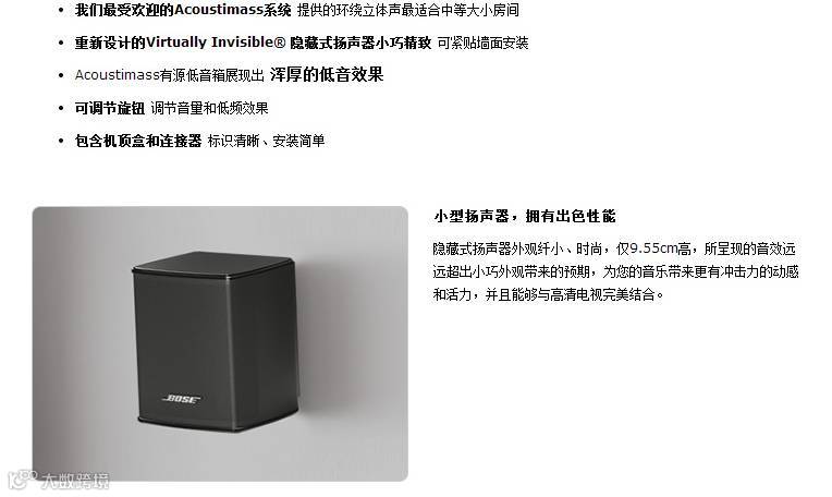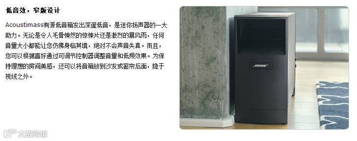 Bose Acoustimass 6 家庭影院系统,由五个卫星扬声器及一台较小巧的低音箱组成。全新改良的防磁卫星式扬声器拥有更大的音圈,令扬声器重播更多的中低能量的更大的音压,采用Acoustimass Speaker Technology 音响气量流扬声器技术,全无方向性,可随意摆放在家中任何角落而不会破坏整体的美观。低音箱内藏两只13.3cm的口径双音圈的低单元,加上专利的Adaptive Energuy Summing(低频量倍增)技术,确保能营造出雄浑的低音效果,可配合每声道10-100瓦之环绕声道功放驱动。