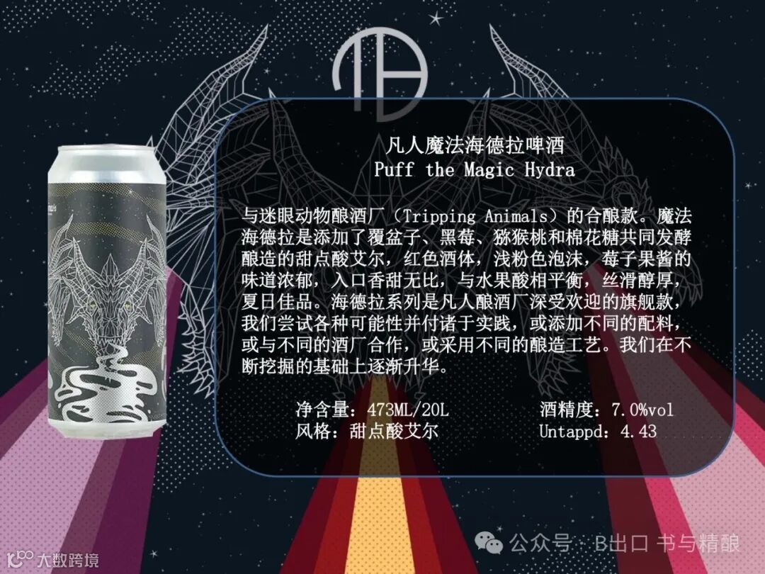 与迷眼动物酿酒厂(Tripping Animals)的合酿款。魔法海德拉是添加了覆盆子、黑莓、猕猴桃和棉花糖共同发酵酿造的甜点酸艾尔,红色酒体,浅粉色泡沫,莓子果酱的味道浓郁,入口香甜无比,与水果酸相平衡,丝滑醇厚,夏日佳品。海德拉系列是凡人酿酒厂深受欢迎的旗舰款。
