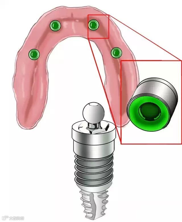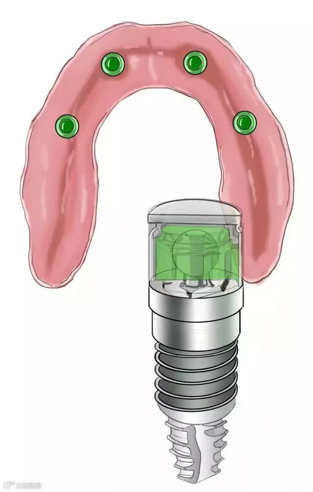 修复基台连接上球帽固位装置——准确的说是“球”,“帽”在总义齿的组织面上。