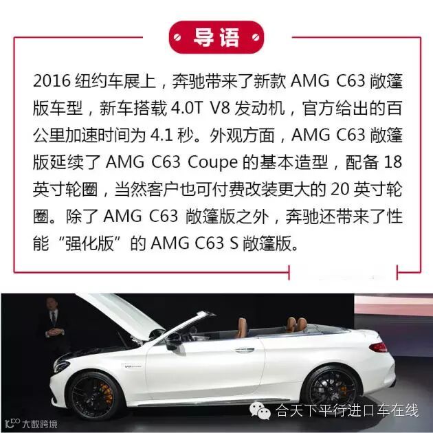 2016纽约车展上,奔驰带来了新款AMG C63敞篷版车型,新车搭载4.0T V8发动机,官方给出的百公里加速时间为4.1秒。外观方面,AMG C63敞篷版延续了AMG C63 Coupe的基本造型,配备18英寸轮圈,当然客户也可付费更换大尺寸的20英寸轮轮圈。