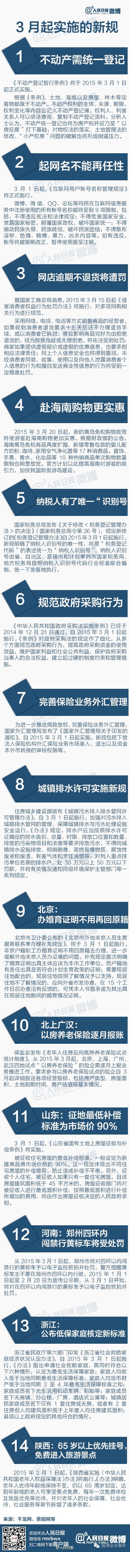 ①3月1日起:不动产需统一登记;起网名不能再任性;纳税人有了唯一识别号;②3月15日起:网店逾期不退货将遭罚;商家提供虚假优惠信息要承担法律责任;③3月20日起:赴海南购物更实惠;④各地新规…详戳↓↓跟你我利益息息相关,转起!
