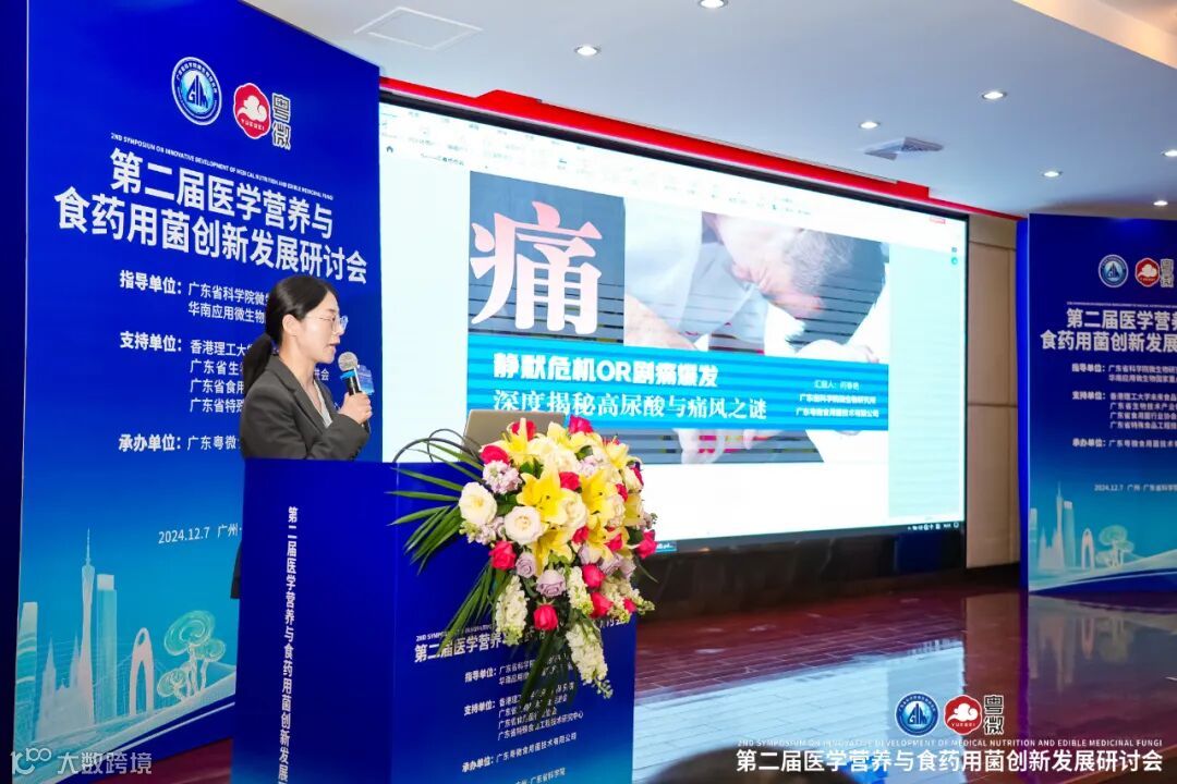 近年来,降尿酸与抗衰产品正成为市场热点。针对这两大热点,粤微研发项目总监何春艳总监展示了粤微公司在降尿酸、抗衰老研发方面的最新科研成果。何春艳总监深入剖析了高尿酸与痛风的发病机制,以及当前治疗方法的局限性。她指出,粤微公司针对这一难题,成功研发出高虫草素含量的蛹虫草提取物,该成分能够通过抑制黄嘌呤氧化酶活性、调节尿酸转运蛋白等作用机制,有效降低血尿酸水平,并缓解痛风症状。