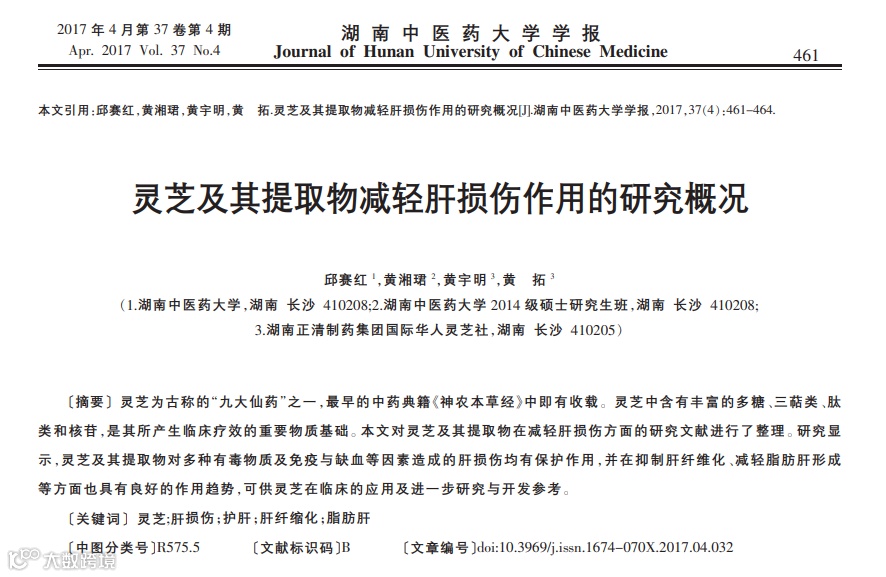 [3]《灵芝及其提取物减轻肝损伤作用的研究概况》邱赛红,黄湘珺等.湖南中医药大学学报 .(2017). [4]孙艳辉, 张宏波. 灵芝多糖对急性酒精性肝损伤小鼠肝脏脂肪沉积及NLRP3炎性小体表达的影响[J]. 世界中医药, 2020, 016(006):842-845.