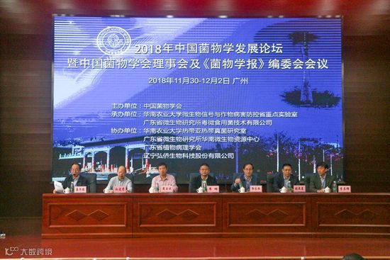 2018年中国菌物学发展论坛暨中国菌物学会理事会及《菌物学报》编委会会议在华南农业大学召开。中国菌物学会理事长郭良栋等来自全国各高校及科研单位的领导、菌物专家和嘉宾近200人与会。会议由中国菌物学会主办,华南农业大学微生物信号与作物病害防控省重点实验室和广东粤微食用菌技术有限公司联合承办,菌物协会副理事长、华南农业大学植物病理学姜子德教授主持。