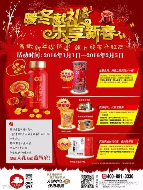 活动期间,消费者在粤微网上商城或直营门店,每购买一瓶30粒装灵芝孢子油,即可加150元换购一盒60g装的全灵芝孢子粉(价值298元)。