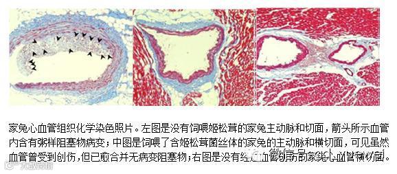 在研究血管粥样硬化的研究中发现,服用姬松茸有助于削减血管中的粥样肿块和加快血管内壁修复。实验以血管气球导管对家兔主动脉造成创伤,伴以高脂饲料喂养12周,再用含0.01%姬松茸子菌丝体的普通饲料23周。结果发现,饲喂了姬松茸的家兔,其中动脉受伤部位肿块明显减退,而没有服食姬松茸的家兔则出现了血管粥样阻塞物(如图)。