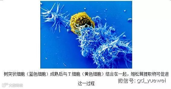 研究发现,姬松茸提取物能促进树突状细胞成熟。树突状细胞是一种传递免疫信息的细胞,它成熟的标志之一就是和“杀手”T细胞结合(图8),并告诉T细胞哪些该杀哪些不能杀;另外,大家常常听说用在肿瘤治疗上的干扰素,也能受到姬松茸提取物的刺激而增加产生。有文献报道,在用细胞培养物实验时,姬松茸提取物对细胞产生干扰素的刺激能力和灵芝相当。