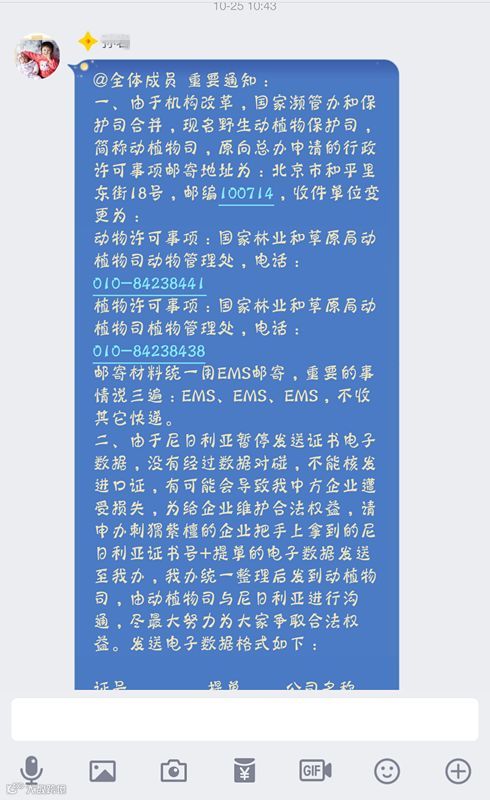 广东的濒危进口许可工作交流群中,濒管人员在10月25日发出的一个通知让绝望中的红木商们看到了一丝希望: