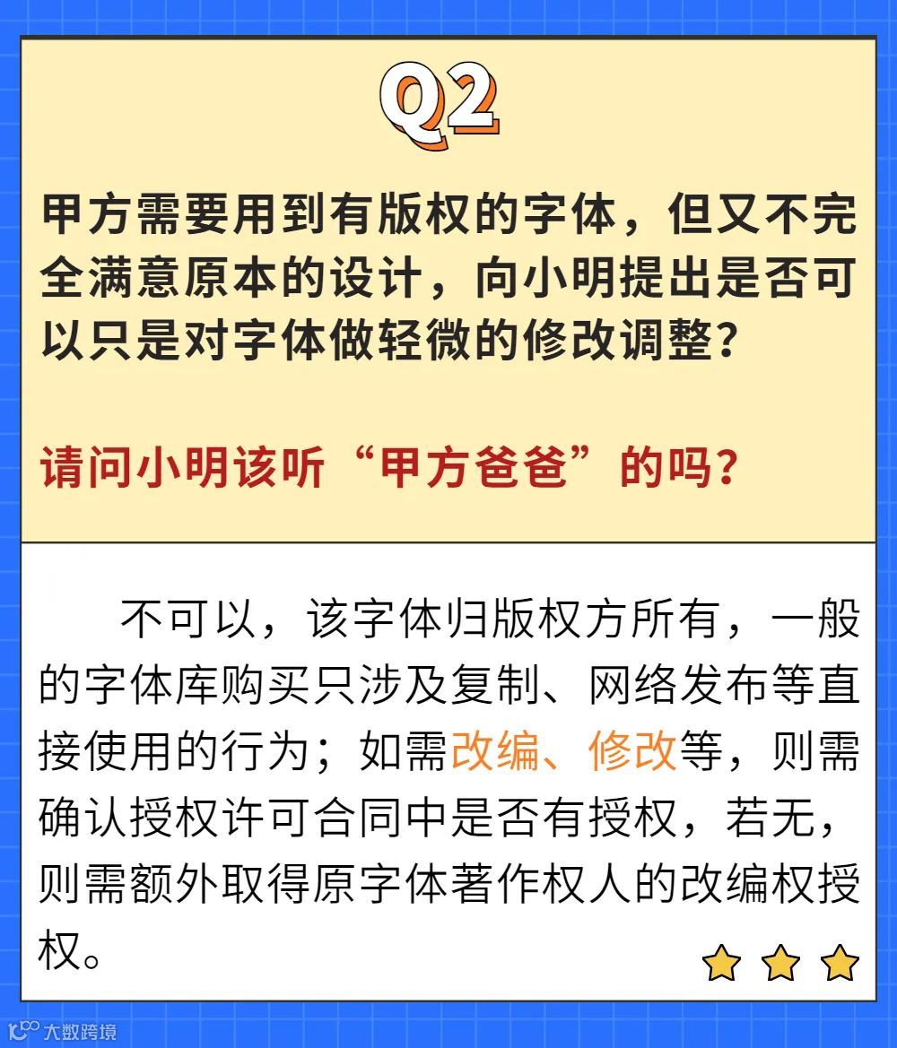 提高版权意识,去正规渠道、网站去下载字体,了解清楚字体归属以及哪些可以免费商用、哪些需要付费授权商用;若确定需要使用付费商用字体的,应向相应字库厂商了解授权范围;