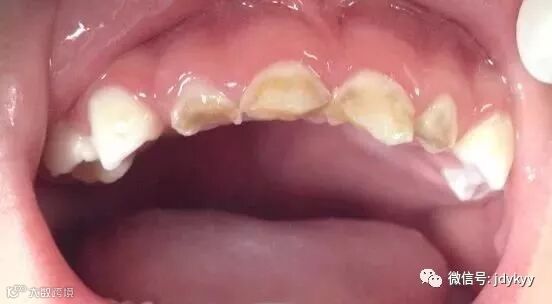 奶瓶龋常见于幼儿的牙齿(图为奶瓶龋)