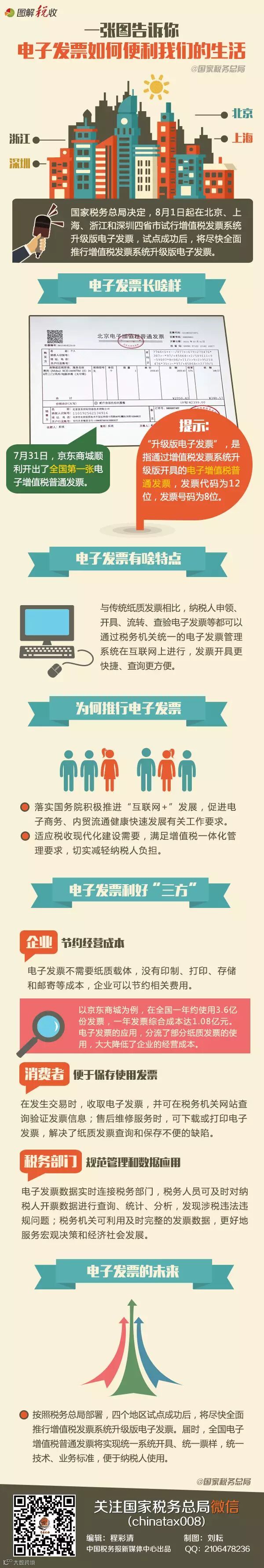 导读:国家税务总局决定,8月1日起在北京、上海、浙江和深圳四省市试行增值税发票系统升级版电子发票,试点成功后,将尽