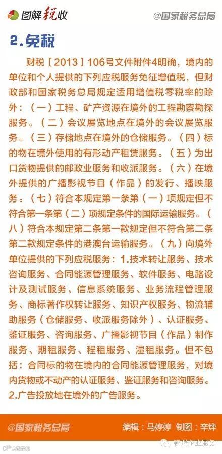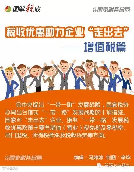党中央提出“一带一路”发展战略,税务总局出台落实“一带一路”十项措施。国家对“走出去”企业、服务“一带一路”发展税收优惠政策主要有增值(营业)税免税及零税率、出口退税、所得税抵免及税收协定等方面。9图学习增值税优惠↓