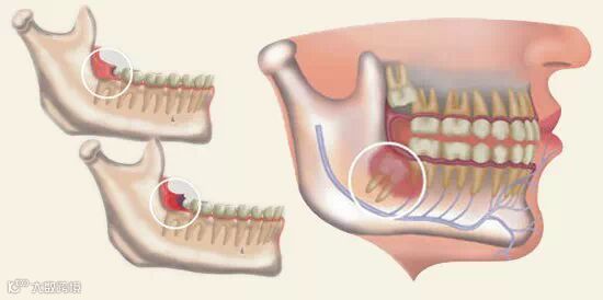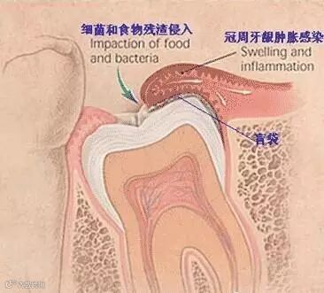 阻生智齿的表面有牙龈瓣覆盖,这样与牙冠之间就形成了一个缝隙,医学上称之为盲袋。食物残屑易藏在里面,加上口腔的温度、湿度又合适,给细菌提供了良好的生长繁殖环境。盲袋里的食物残渣即使刷牙、漱口也不容易清除。在正常情况下,细菌所造成的危害并不明显,但在感冒、疲劳、抵抗力降低时,它就会乘虚而入造成机会感染,这就形成了智齿冠周炎。