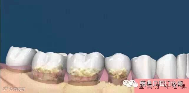 图片六、牙龈以下的牙结石得寸进尺,越来越多,扩大地盘,这进一步刺激牙槽骨,导致大量的牙槽骨向下退缩,牙槽骨遭到破坏,牙根露出更明显。