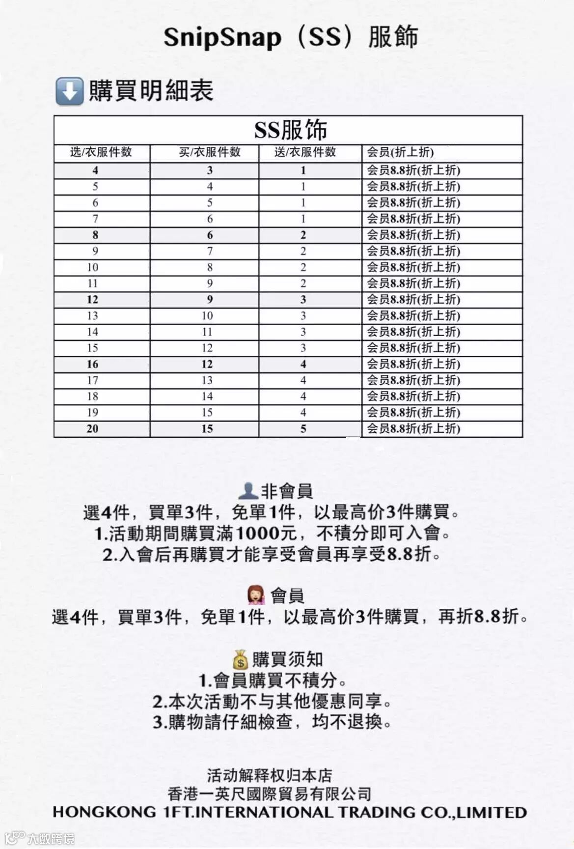 服装产品购买明细表: