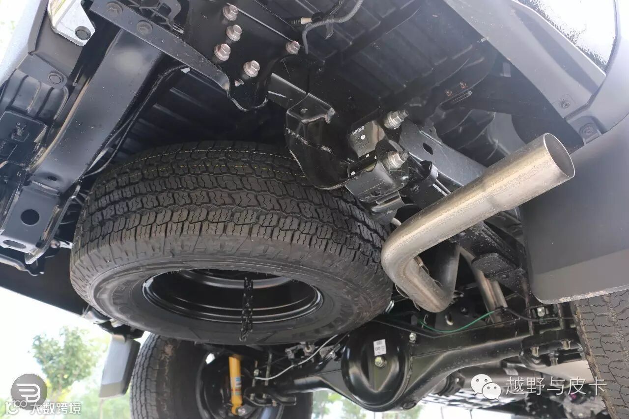 后悬挂采用钢板弹簧整体桥结构,相比前独立悬挂,整体桥的悬挂行程更加充足,但高速越野时的稳定性就不如独立悬挂了。