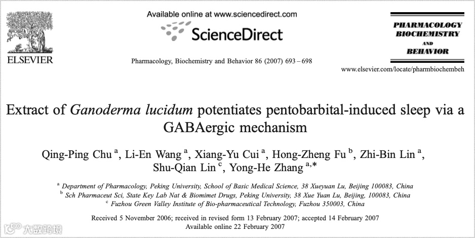 [3]Extract of Ganoderma lucidum potentiates pentobarbital-induced sleep via a GABAergic mechanism. Pharmacology, Biochemistry and Behavior, 2007, 86 (4): 693–698.[4]曹素芳,王新瑞,张晨,等.关于灵芝改善睡眠功能的研究[J].浙江食用菌,2009,17(06):52-54.
