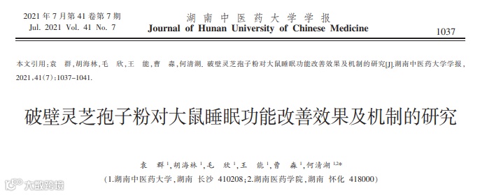 [2]袁群,胡海林,毛欣,等.破壁灵芝孢子粉对大鼠睡眠功能改善效果及机制的研究[J].湖南中医药大学学报,2021,41(07):1037-1041.