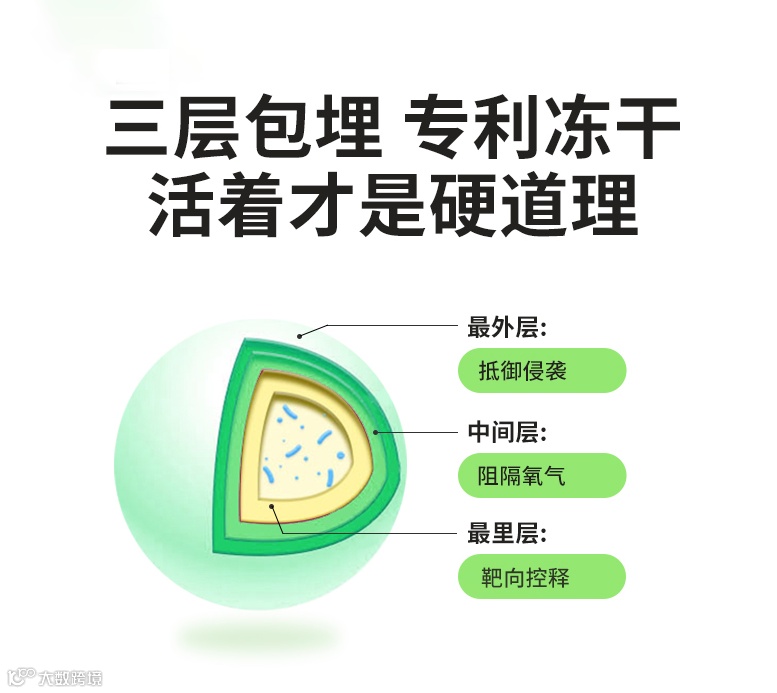 粤微复合益生菌粉采用了《一种双歧杆菌冻干菌粉的制备方法》《一种嗜酸乳杆菌冻干菌粉的制备方法》,冷冻干燥专利技术,使得益生菌在低温休眠暂缓细胞代谢,始终保留活性。加上3层细胞活性包埋技术,及阻隔外界胁迫,保障产品耐受稳定性及功效发挥。其中,最外层抵御外界挤压及酸碱侵袭,中间层阻隔氧气避免变性失活,最里层维持细胞活性稳态,让每一株益生菌都能够顺利活着到达肠道并定殖、发挥功效。成为肠道护卫菌、减脂小能手、脂肪搬运工、菌群优化师。