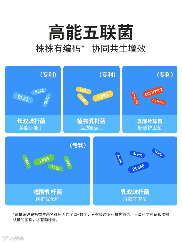 粤微复合益生菌粉的每一株益生菌都有明确的编号,相当于它们的身份证,包括:乳双歧杆菌BLa80、嗜酸乳杆菌LA85、乳酸片球菌CCFM7902、植物乳杆菌Lp90、长双歧杆菌BL21。要知道不是所有菌都适合放在一起,只有经过大量实验验证,才能达到共生增效的作用。粤微益生菌通过菌种资源库平台分离、优化搭配和功能验证,筛选出5联高效协同“不打架”的复配菌株。
