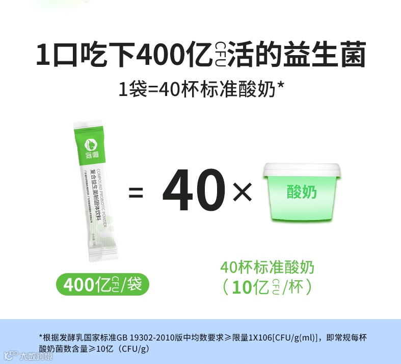 根据发酵乳国家标准GB19302-2010版中菌数要求≥限量1X106[CFU/g(ml)],即常规每杯酸奶菌数含量≥10亿(CFU/g)。而粤微复合益生菌,一盒的添加量高达2400亿CFU活菌,每一袋活菌的添加量便是400亿CFU活菌,如果你每天喝一袋,一杯酸奶相按照10亿CFU计算,就相当于40杯酸奶的添加量。