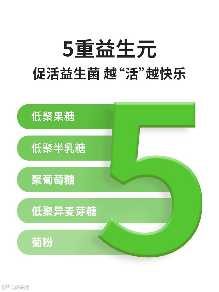 除了上述高能5联益生菌,粤微复合益生菌粉更值得关注的还有益生元,分别是聚果糖、低聚半果糖、聚葡萄糖、低聚异麦芽糖、菊粉等5重国际公认益生元复配组合,它们与益生菌组合CP活力加乘,给益生菌续命粮食,促活益生菌。