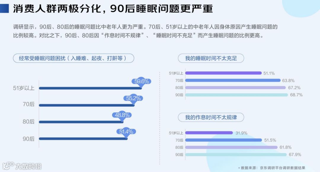对比之下,90后、80后因“作息不规律”导致不佳睡眠状态的占比均超过60.0%,90后用户因“睡眠时间不足”的占比高达68.7%。由此可见,睡眠问题已经出现年轻化倾向。