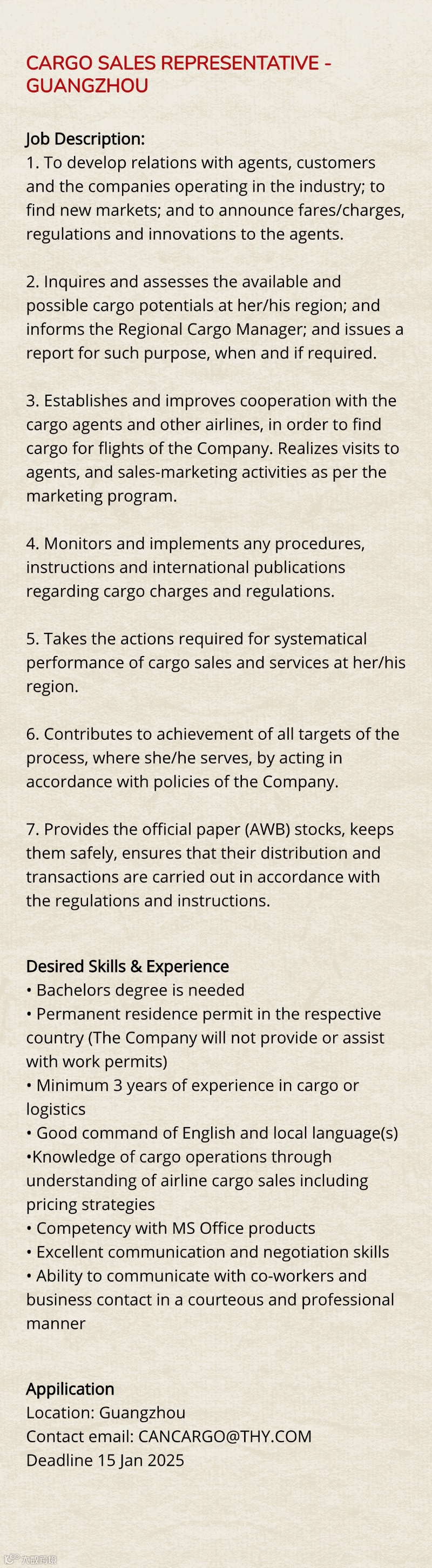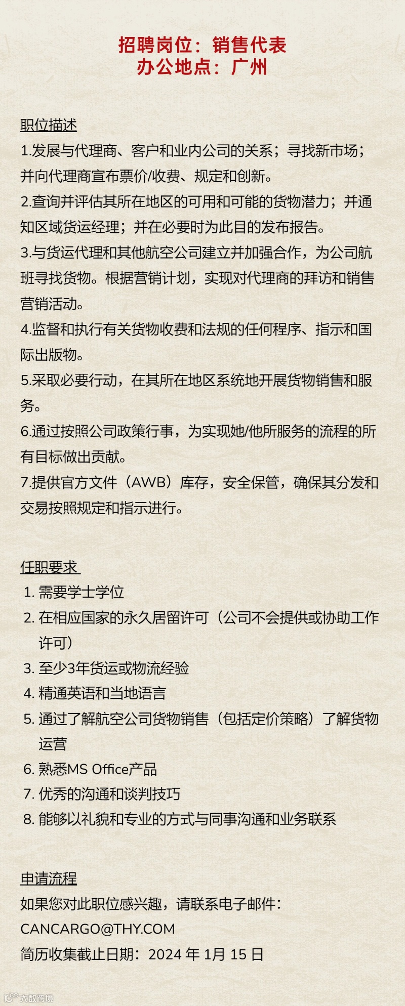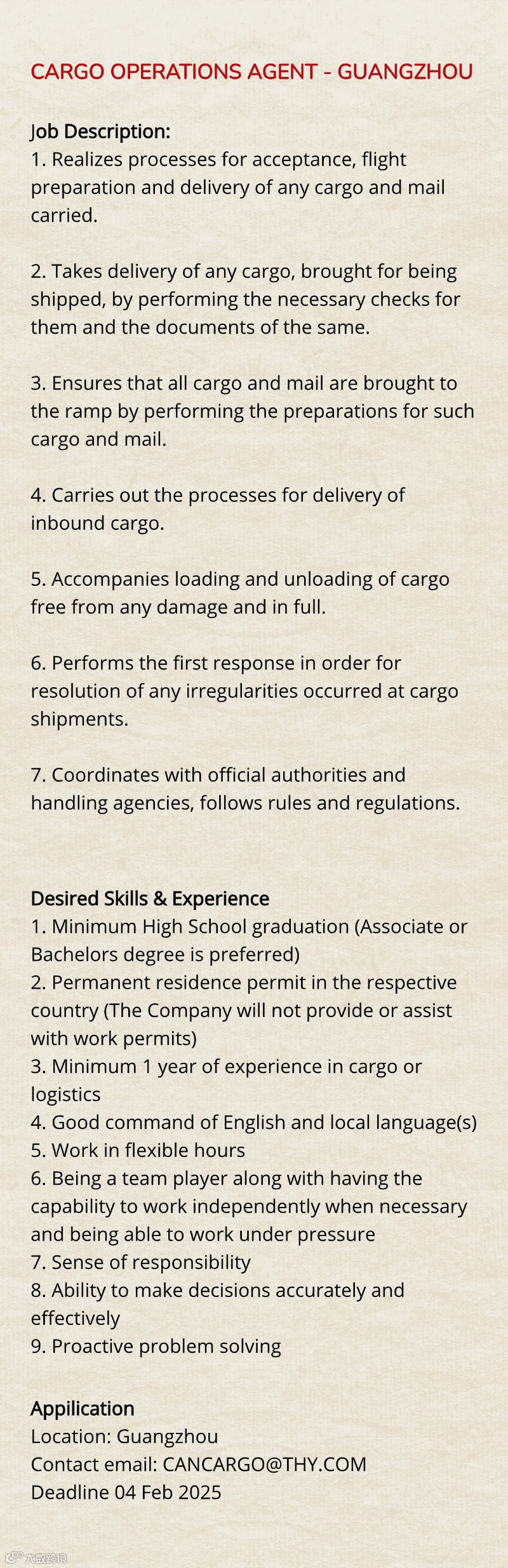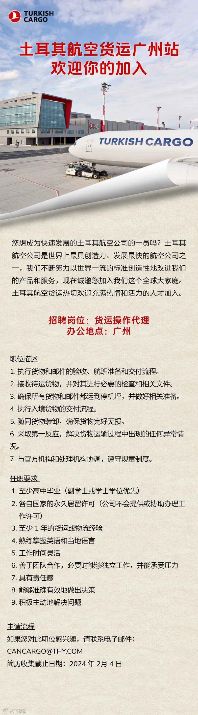 【广州招聘】土耳其航空货运广州站招聘启事,共2个岗位,待遇优厚,“职”等你来!