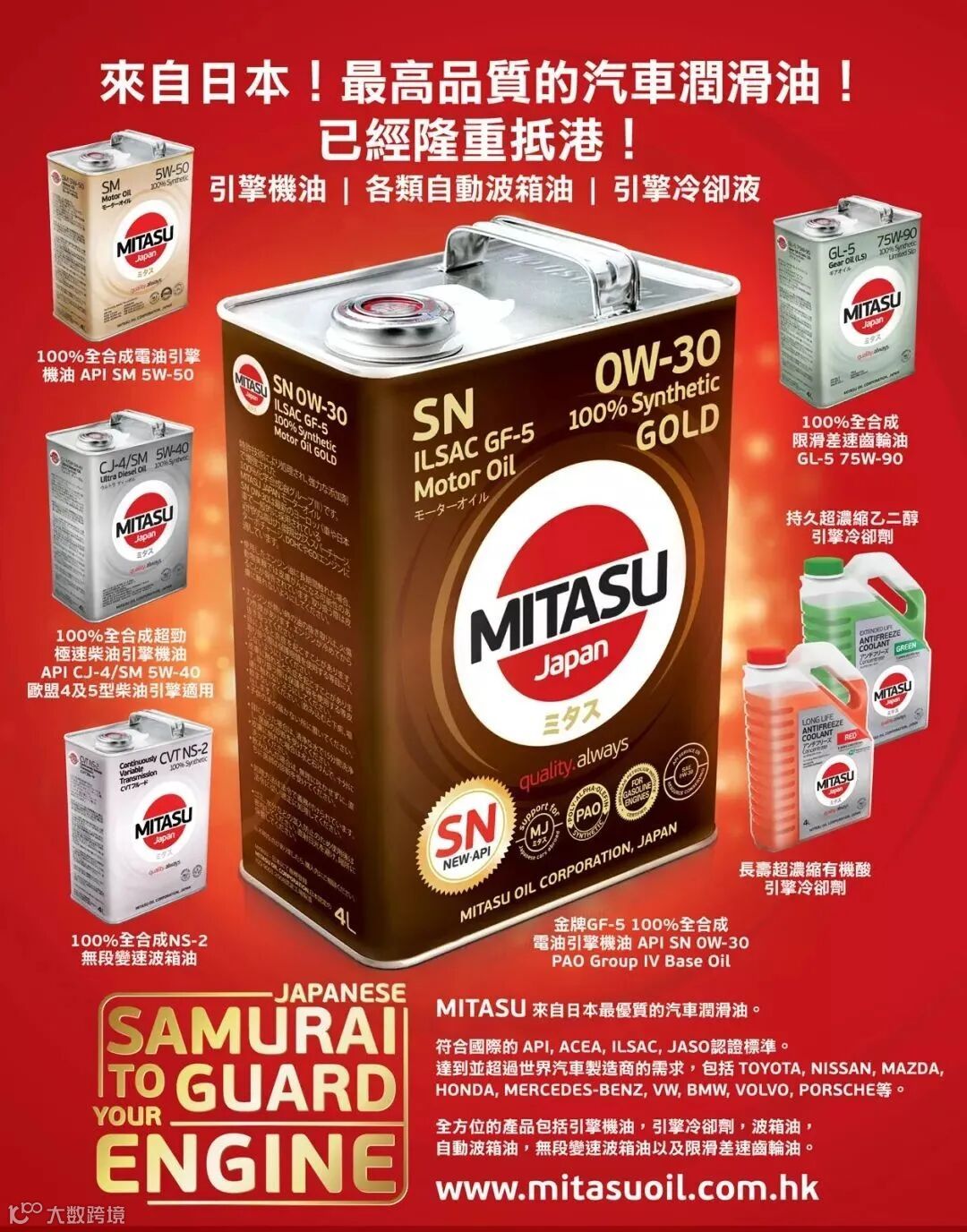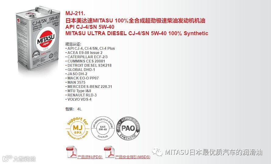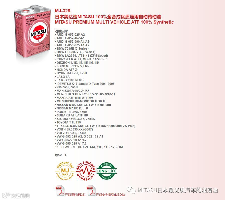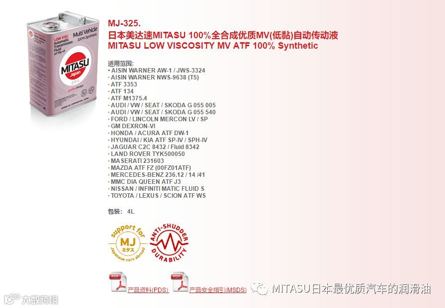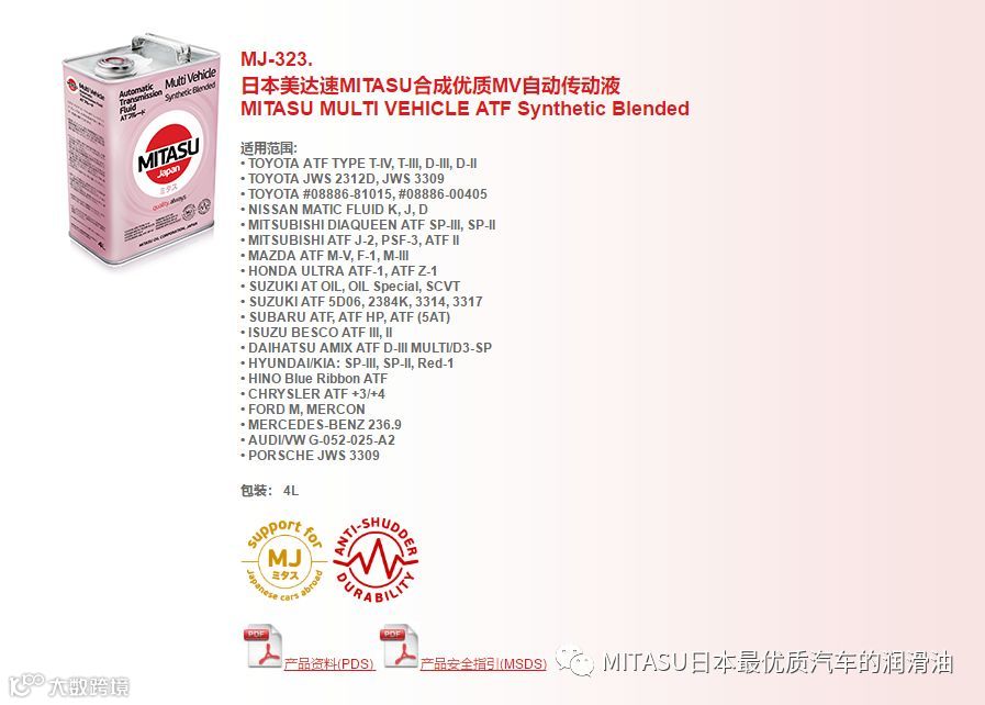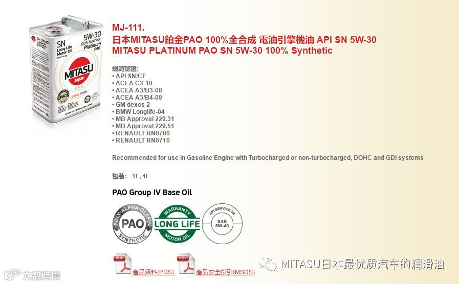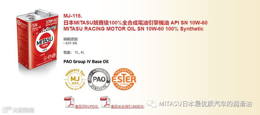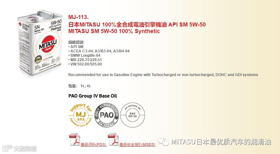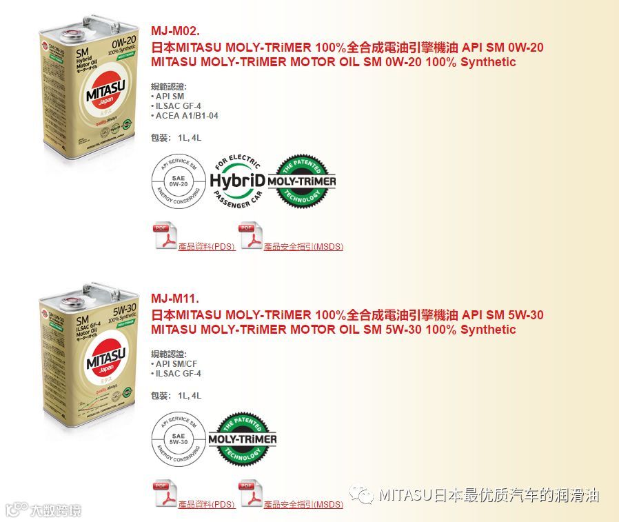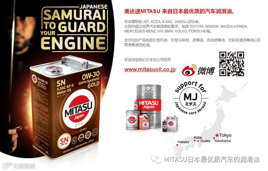 MITASU是日本MITASU石油有限公司的全资子公司,主要负责高品质机油和添加剂的研发和销售。MITASU日语直接翻译为“ミタス”,是“满意”的意思;直接翻译成中文,则有“御手”的意思。不论是日语还是中文,都隐含着高品质的定位。MITAUS凭借着多年化工油液的生产经验,早已跻身日本一线汽车机油品牌之列。