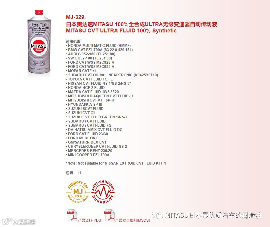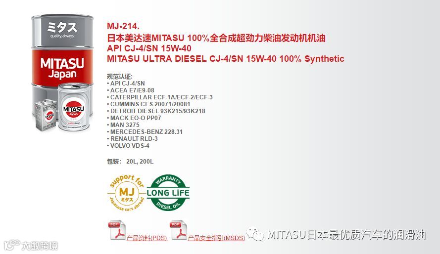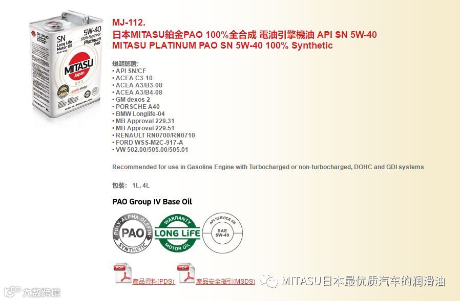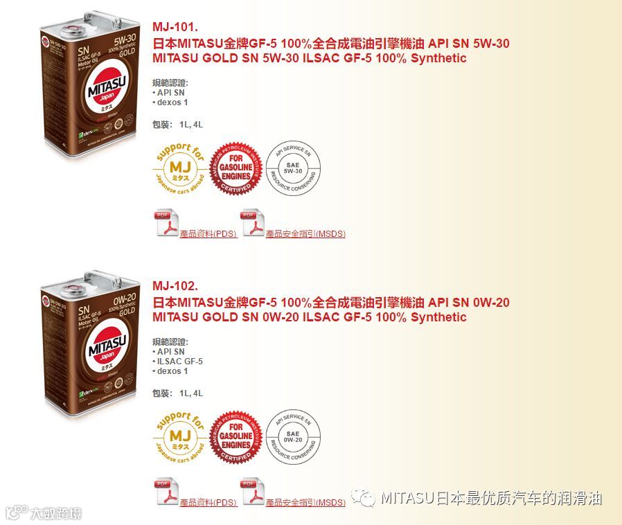 正是由于MITASU从基础开始严格的品质把关,使得旗下的油液产品品质优异。如今,MITASU不但获得了大部分汽车品牌的认可,通过了包括TOYOTA、NISSAN、MAZDA、HONDA、MERCEDES-BENZ、VW、BMW、VOLVO和PORSCHE等厂家严格的机油标准;而且每年都能通过API、ACEA、ILSAC以及JASO等国际机油标准的认证,其性能和品质毋容置疑。