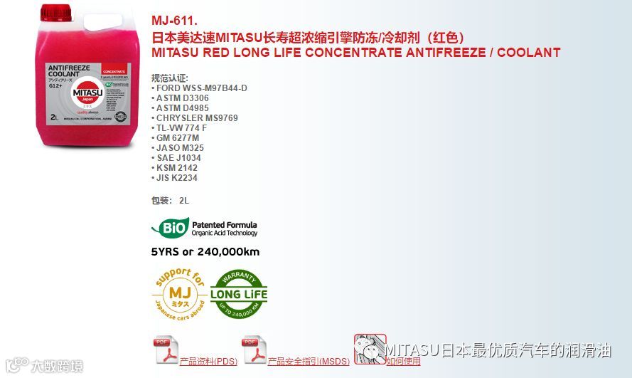 除了机油和变速器油外,MITASU还推出了RED LONG LIFE CONCENTRATE ANTIFREEZE/COOLANT(长效浓缩防冻液/冷却液)。这款冷却液的使用寿命为5年或24万公里,可保护冷却系统中的金属材料,以防止其在工作过程中出现腐蚀,同时不会损坏系统中的橡胶、塑料部件。其中加入的有机酸缓蚀剂,则能够在系统内部形成保护膜,使冷却系统能够长时间处于最佳的工作状态。