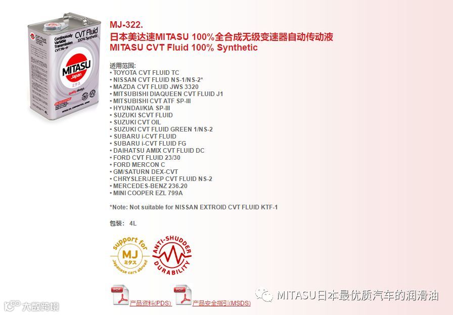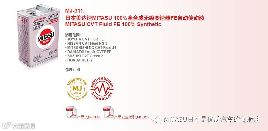 MITASU推出的变速器油,面向CVT、AT和MT三种类型的变速器。其中,适用于CVT变速器的,有包括CVT FE、CVT Fluid以及CVT ULTRA FLUID三种;适用于AT变速器的,包括有MULTI VEHICLE ATF、ATR T-IV、LOW VISCOSITY MV ATF、ATF Z-I以及PREMUM MULTI VEHICLE ATF五款;适用于MT变速器的,包括有GEAROIL和RACING GEAR OIL两款。