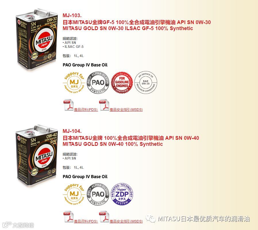 MITASU的产品线,涵盖了汽油引擎机油、柴油引擎机油、自动变速器油、齿轮油以及冷却液,基本可以覆盖汽车上使用的油液产品。值得一提的是,MITASU推出的所有油品,都是在4号PAO基础油的基础上,配合独特的添加剂调配而成;要知道,4号PAO基础油虽然品质优异,但价格也相当昂贵。坚持以4号PAO基础油作为品牌旗下油液的主要原来,由此可见MITASU“满意”之意义并非浪得虚名,而是实打实地换来的。