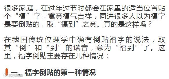 贴在大门的“福”字必须正着贴,寓意开门迎福,福气临门的吉祥美誉,如果大门的“福”字的倒着贴话,可就把福气倒在门外了,跑到别人家里去了哟!大“福”字也得顺着贴,这才能起到正福临门,否则把“福”字打倒了,福气溜着了。