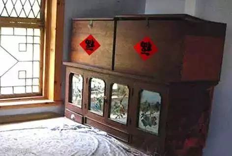 第二种情况,在屋内的柜子上。柜子是存放物品的地方。倒贴福字,表示福气(也是财气)会一直来到家里、屋里和柜子里。