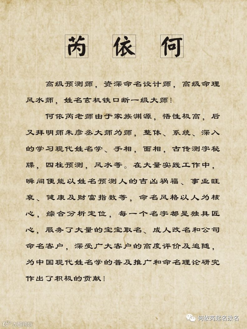 何:“八字如人的身体,姓名则如精神,虽然有着区别,却存于一体。精神气足则身体健旺,精神萎糜则身体衰弱,精神长存则健身,精神丧尽则亡身。如果先天八字条件好,加以姓名数理相调和,将会有更好的人生,反之,如果先天八字有欠缺,用姓名数理则能够起到补充扶助的作用,同样出可开创美好的人生。”