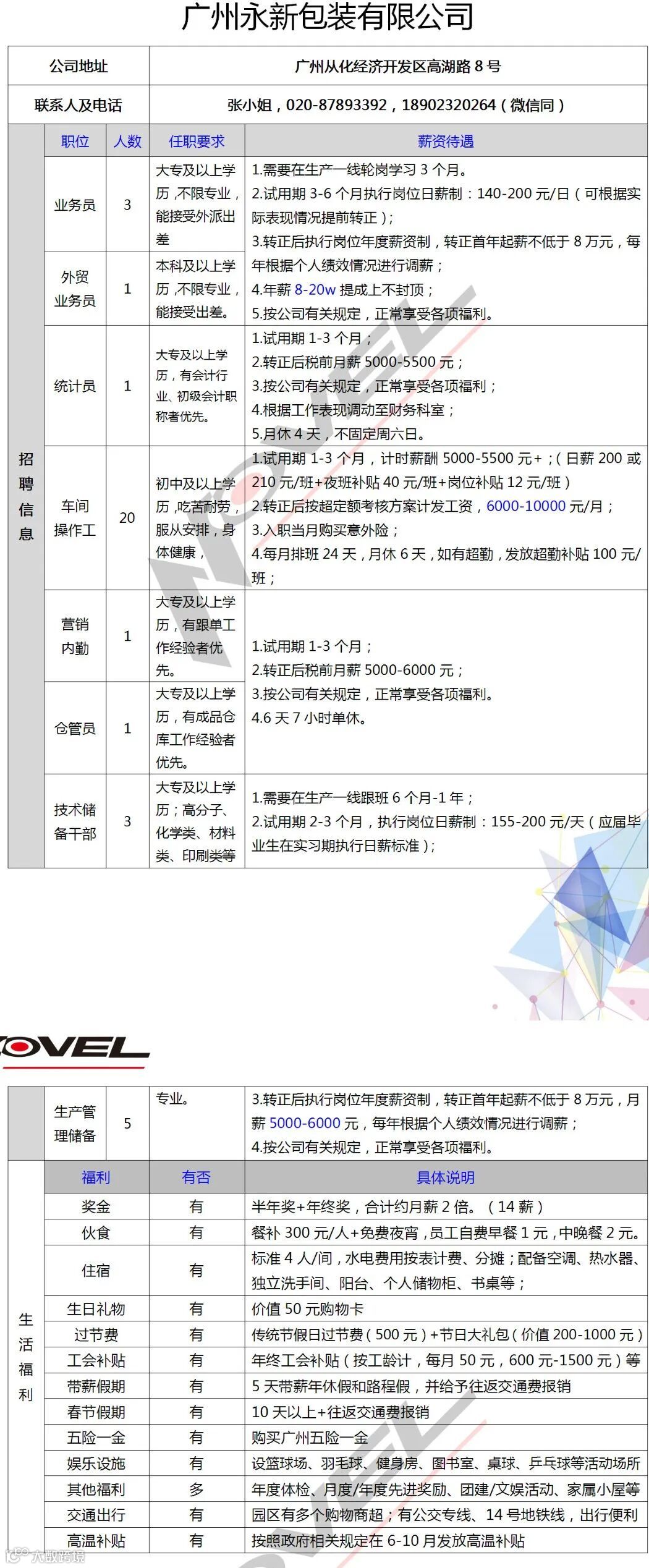 【广州招聘】有岗年薪8-20万!统计员、营销内勤、外贸业务员等岗位,提供食宿、奖金等福利齐全!广州永新包装有限公司