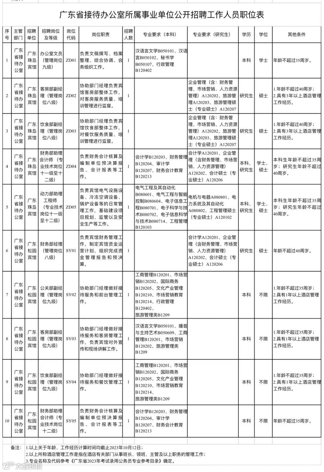 公开招聘7名管理人员和3名专业技术人员,详见《广东省接待办公室所属事业单位公开招聘工作人员职位表》(附件)。