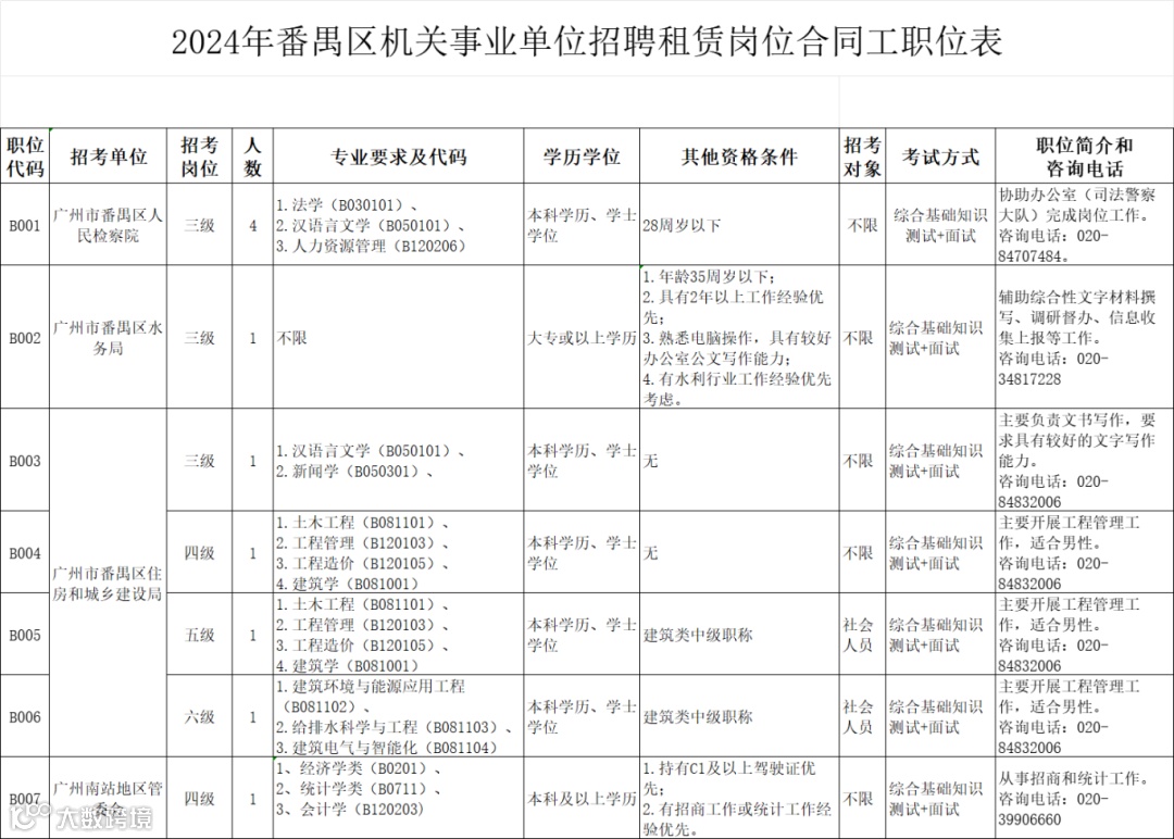 1.具体要求详见《2024年番禺区部分机关事业单位租赁岗位合同工招聘职位表》。