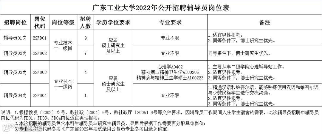 公告详情:查看公告→广东工业大学2022年公开招聘辅导员公告