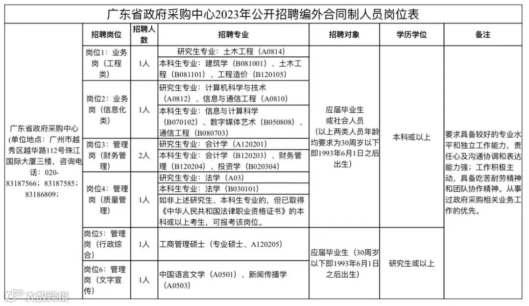 根据工作需要,本次拟招聘7名合同制人员,具体要求见《广东省政府采购中心2023年公开招聘编外合同制人员岗位表》(详见附件)。