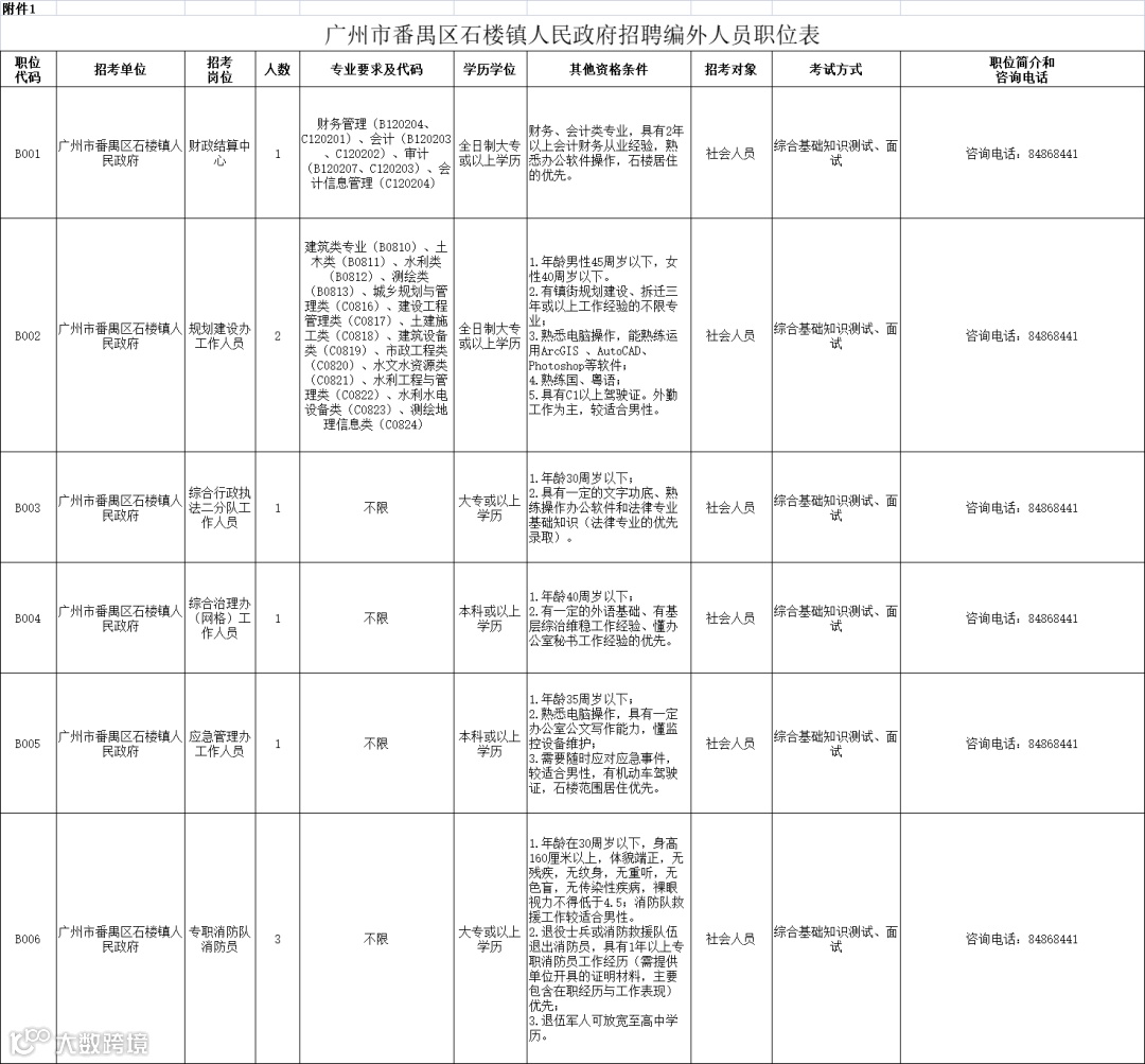 附件1:广州市番禺区石楼镇人民政府招聘编外人员职位表