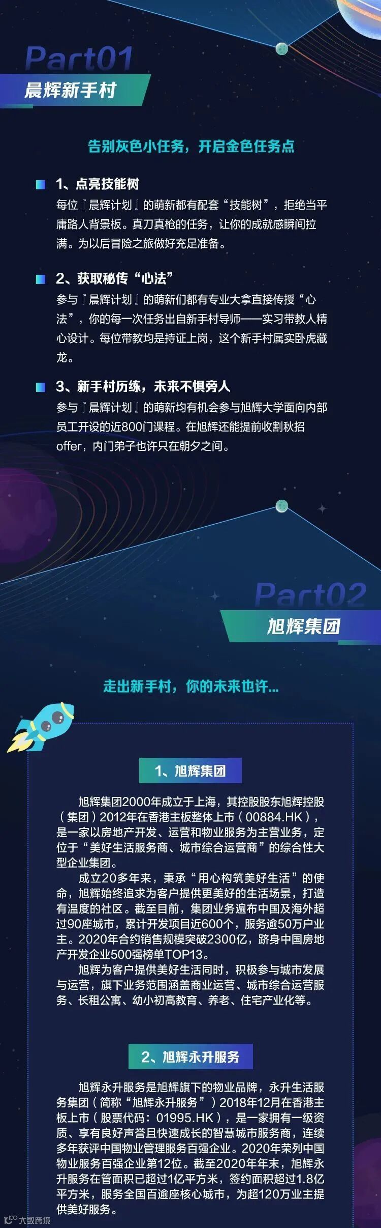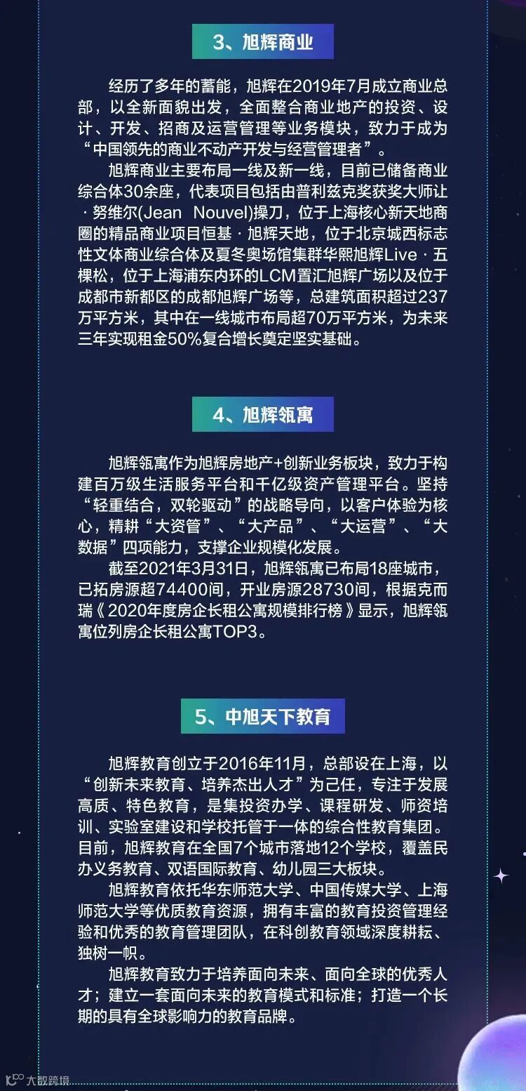成立20多年来,秉承“用心构筑美好生活”的使命,旭辉始终追求为客户提供更美好的生活场景,打造有温度的社区。截至2020年12月31日,集团业务遍布中国及海外超过90个大中城市,累计开发项目超550个,服务逾40万户业主。2020年合约销售规模突破2300亿,跻身中国房地产开发企业500强榜单TOP14。