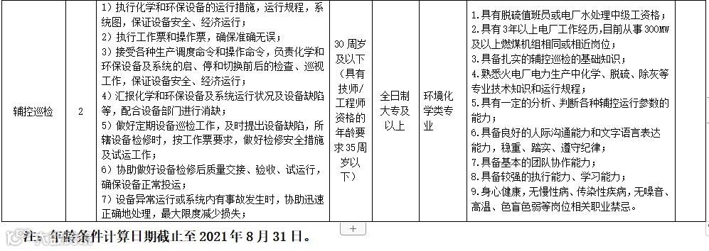 3.目前从事300MW及以上燃煤机组相同或相近岗位,且满3年及以上工作经验;(工作年限条件计算日期截止至2021年8月31日)