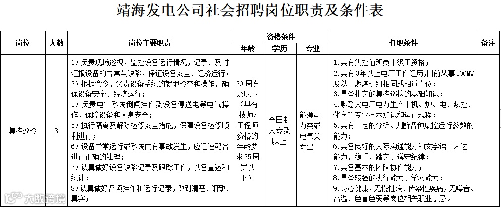 见附件《靖海发电公司招聘岗位职责及条件表》。